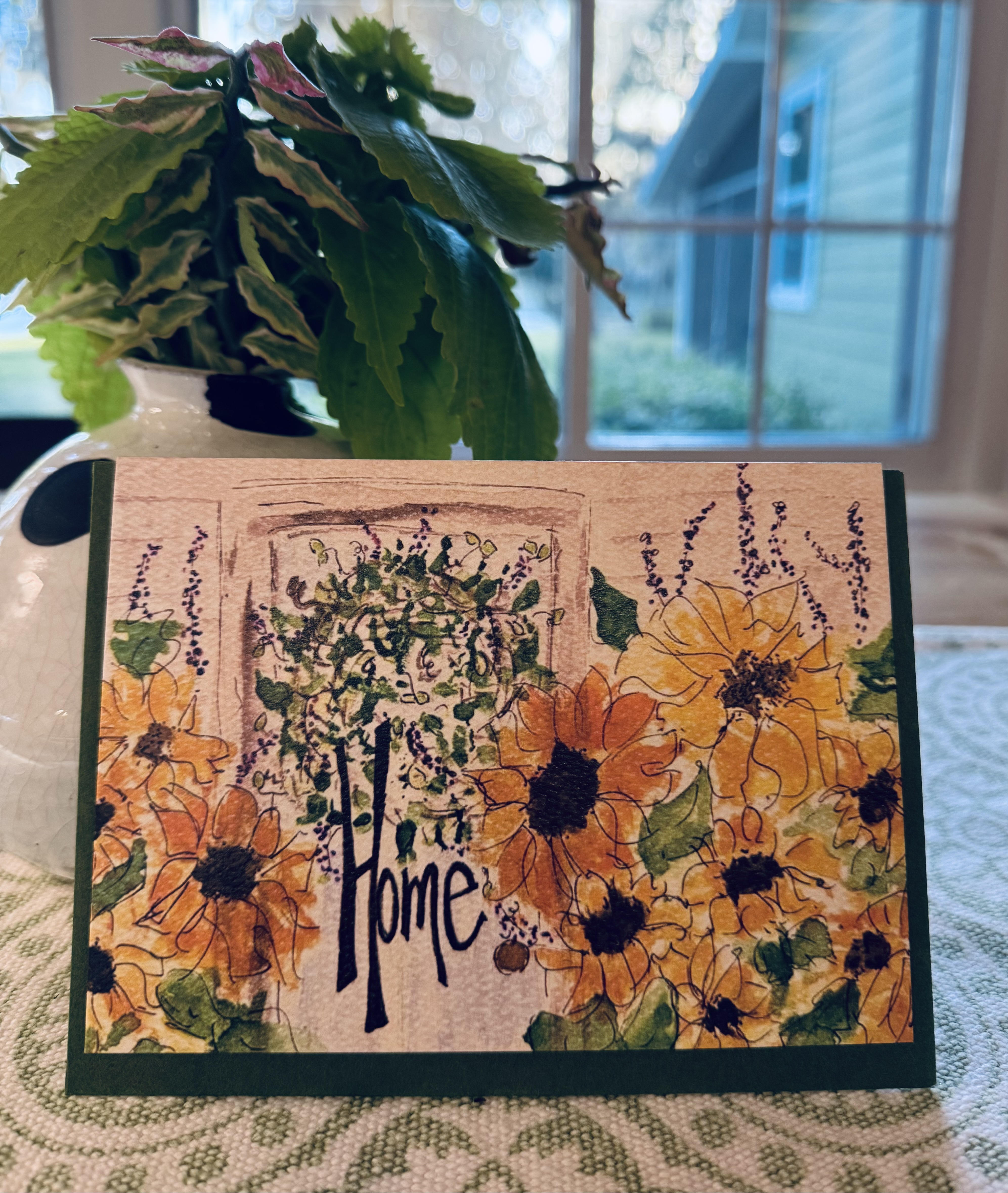 This welcoming front door watercolor is printed on heavy felt weave paper, tucked into a high quality rich green envelope presents a thoughtful way to celebrate a new home with those we love. Of course, if you’re selling homes this can come in handy too…adding that special touch that makes you a cut above. Either way, with a bouquet of sunflowers your celebration is complete!