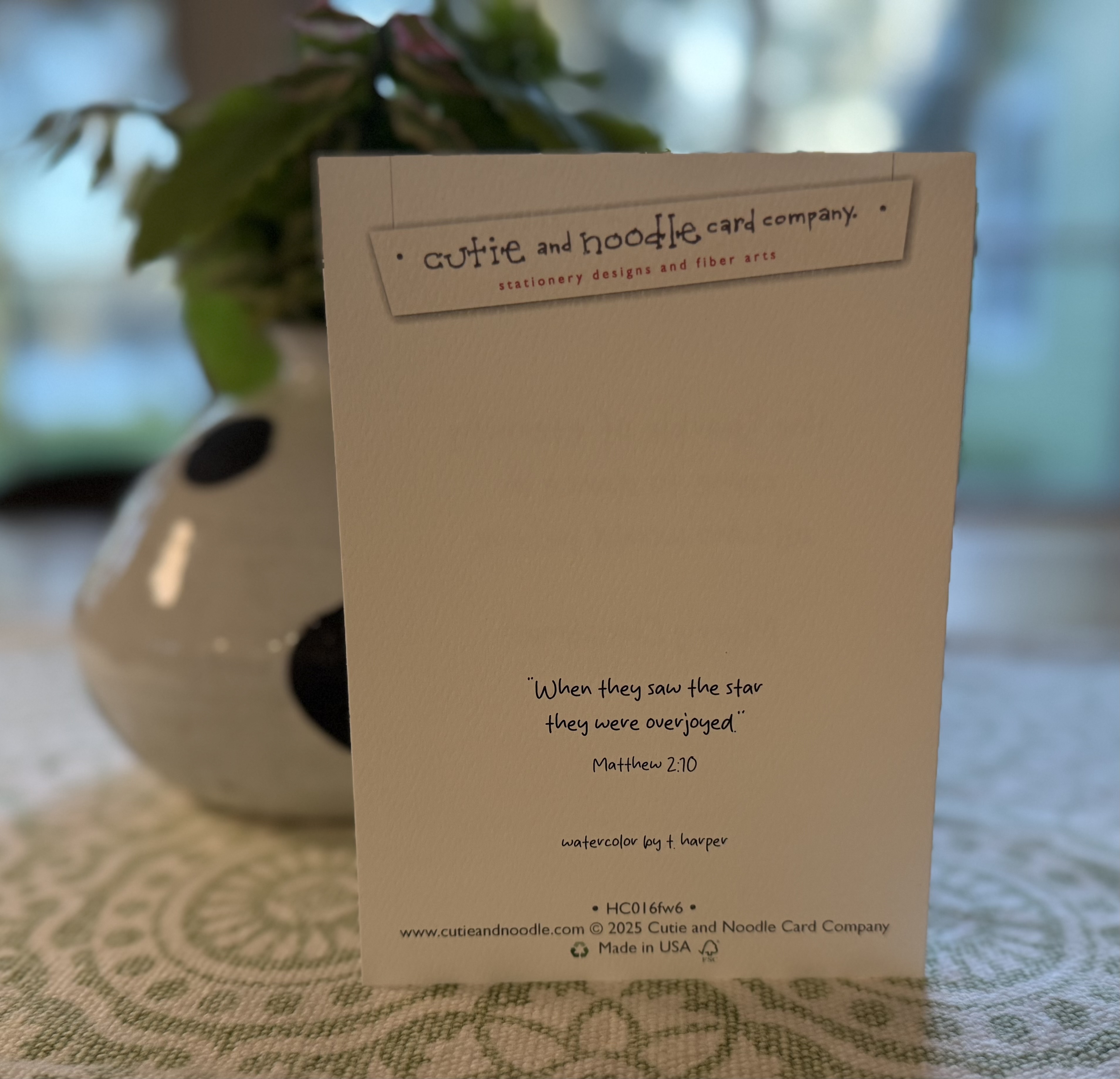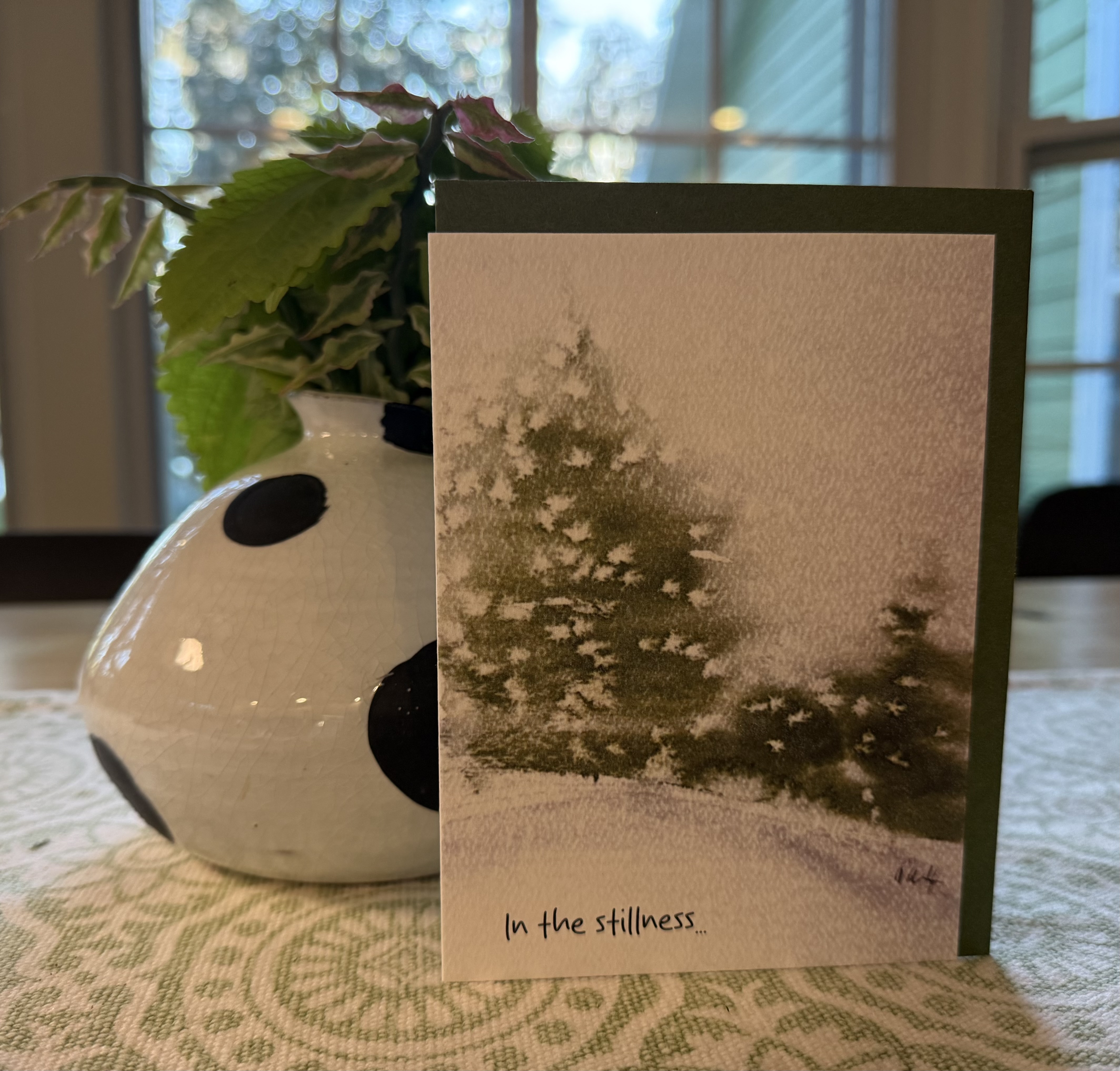 The magic that comes with the Christmas story is shared in this beautiful sentiment. The felt weave printed watercolor comes with an envelope of deep sage green.