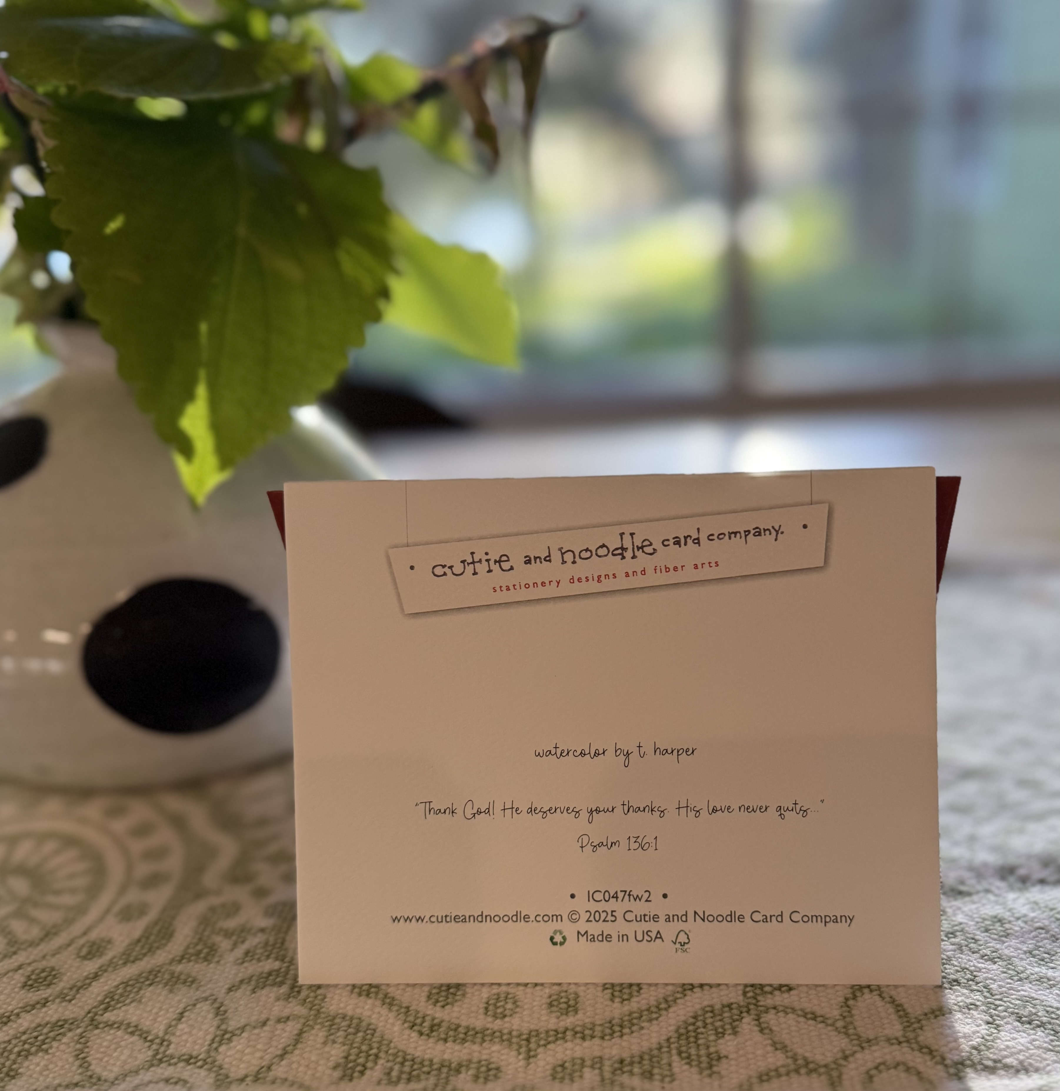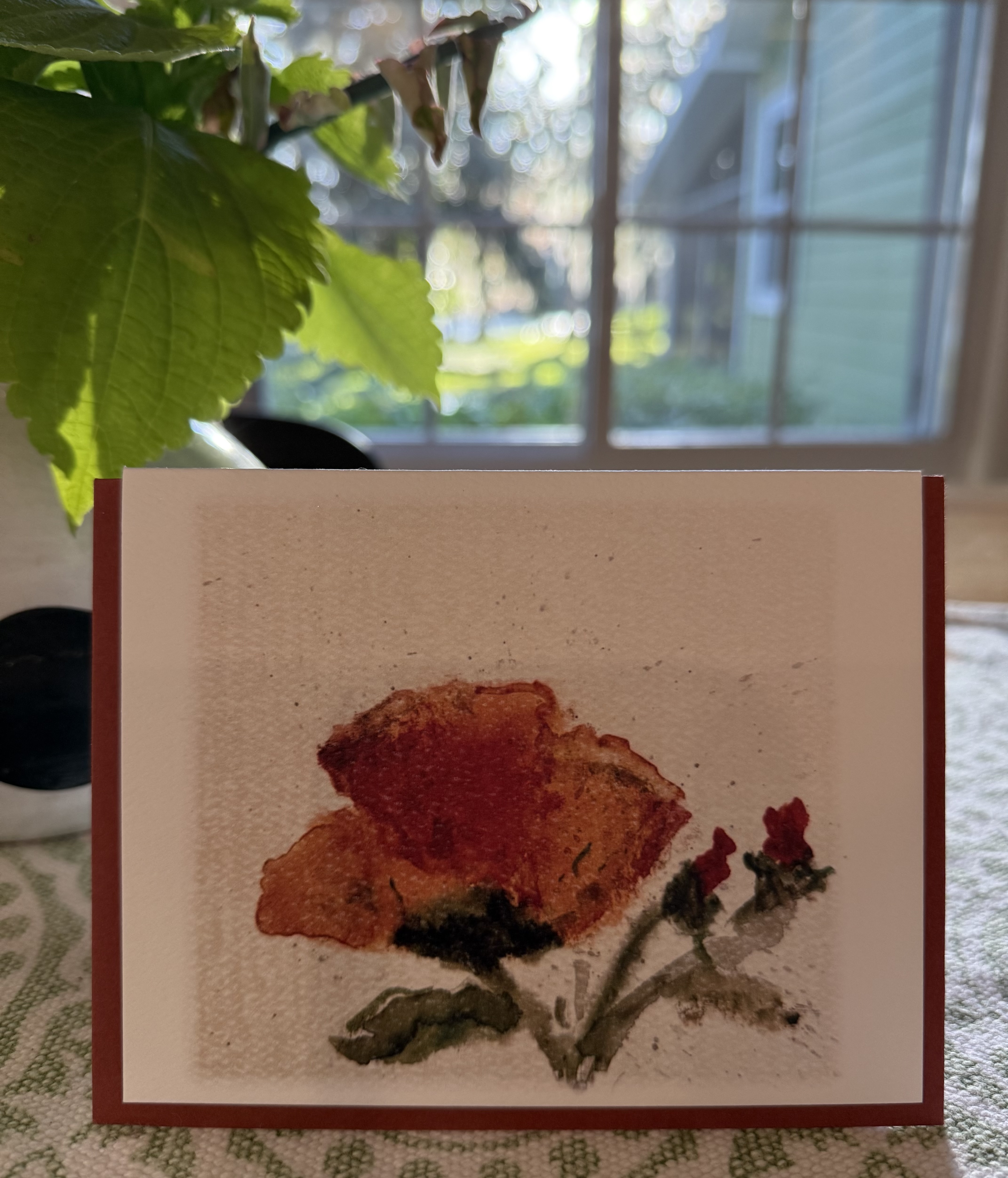 The elegant little felt weave card, accompanied with a heavy weight brick-colored envelope, is handy to have on hand for those kind people in our lives who invite us to dinner, help us with a project or just make us happy. A grateful heart is the key to a good life.